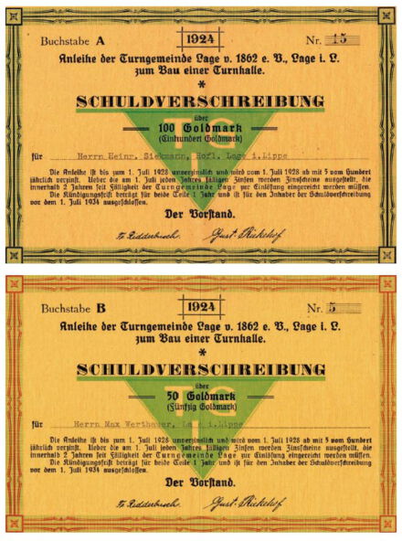 Bis zum Sommer 1920 hatte man bereits tausend Mark gesammelt. Und nach der Vereinigung des Turnvereins mit dem Turnverein Jahn zur Turngemeinde Lage im August 1920 hatte sich der Kreis der Anzusprechenden vergrößert. Frühere Vereinsmitglieder in aller Welt wurden zu Spenden aufgerufen, eine Reihe von Unterhaltungsabenden wurde veranstaltet und jeglicher Anlass zur Sammlung von Spenden wurde wahrgenommen.